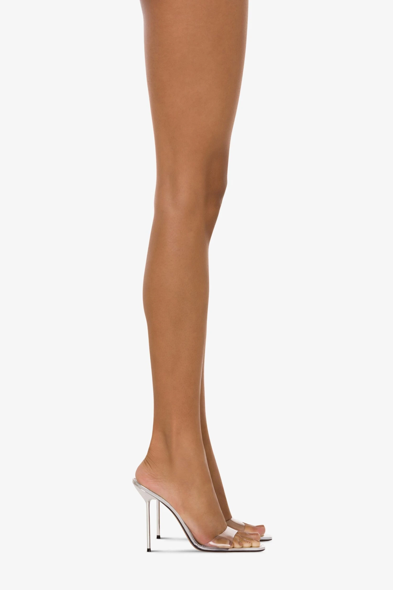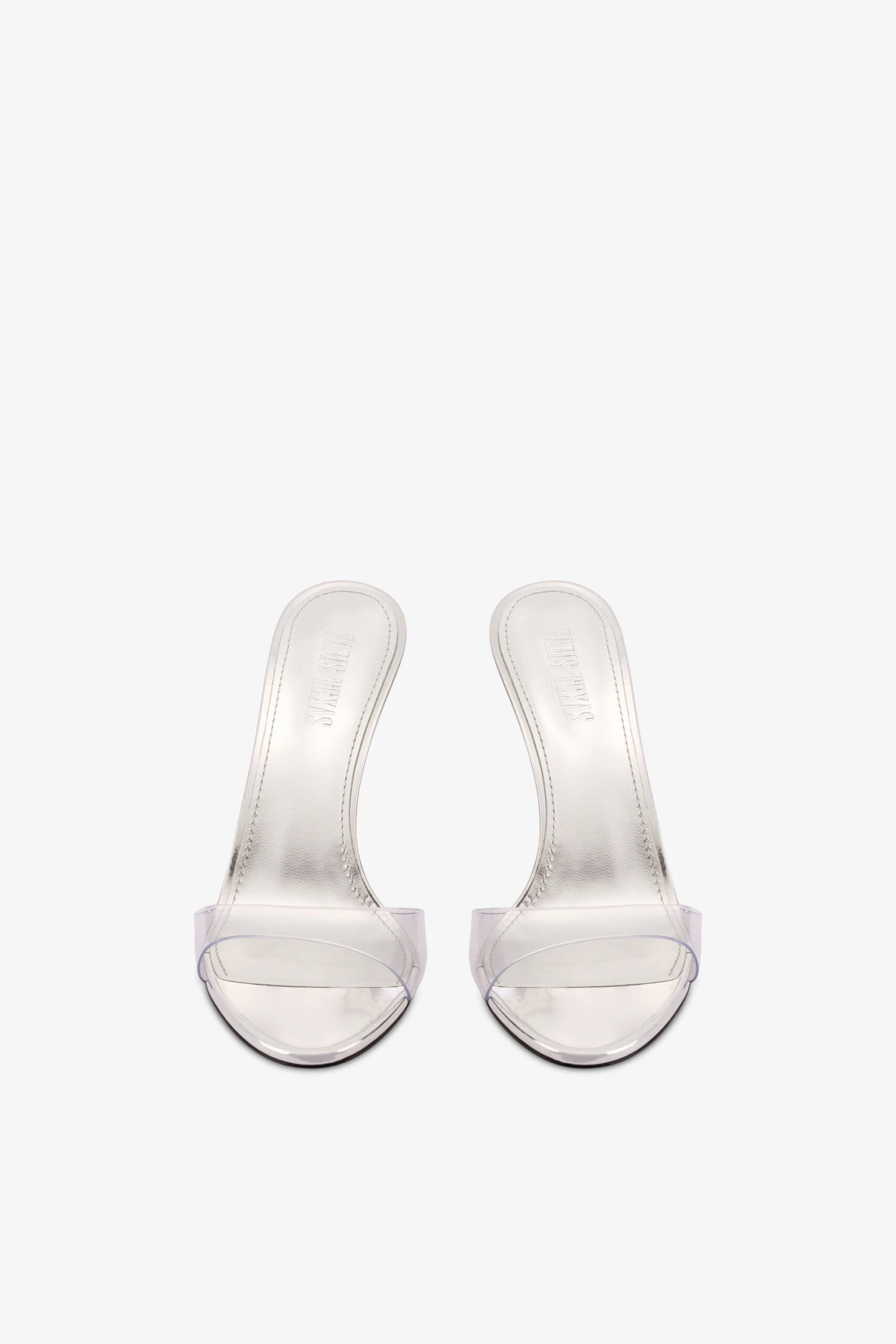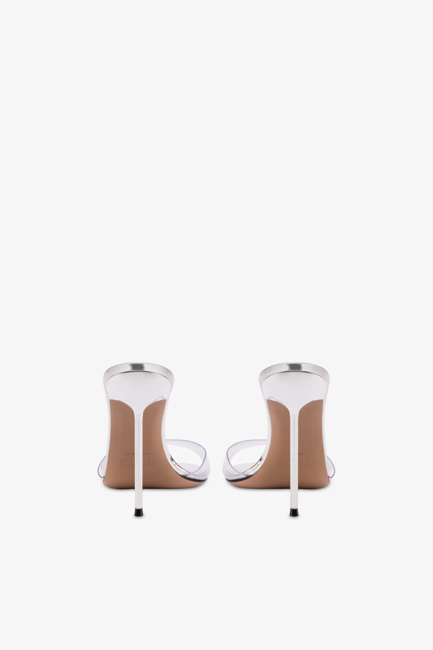 The Lidia mule showcases a simple design, with a chic and sophisticated touch. The shoe is crafted from mirrored leather and PVC in tones of silver for a high-octane finish, and is set on a slender 105 mm heel that magically elongates the leg.