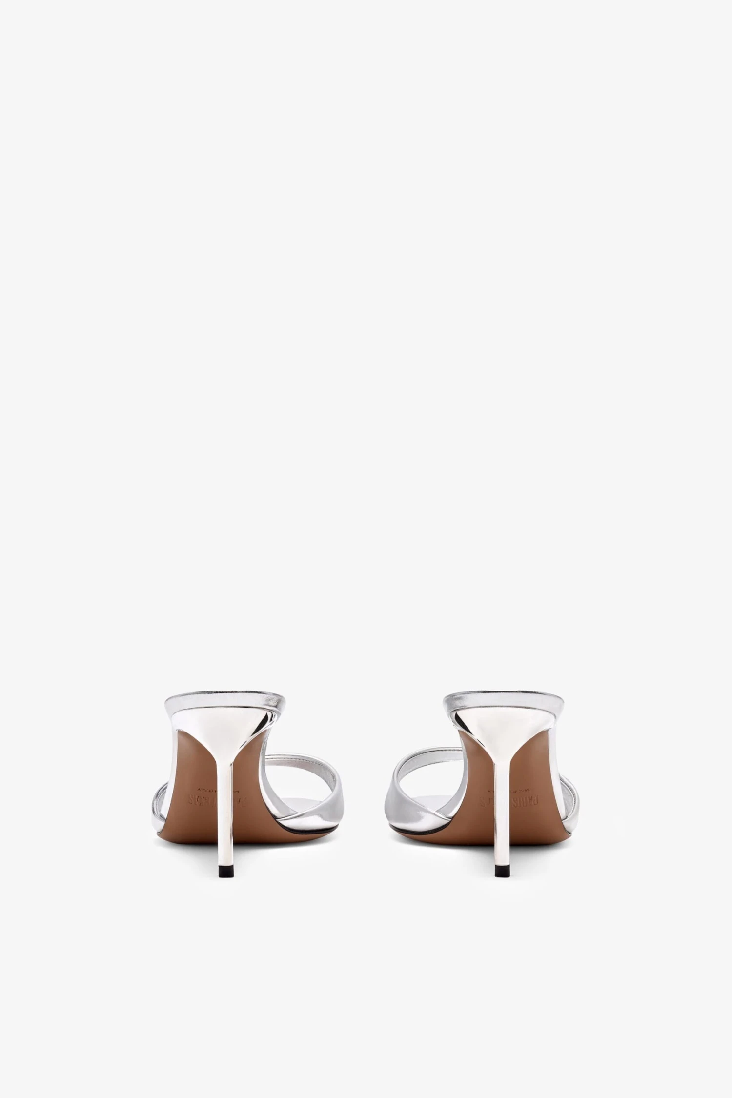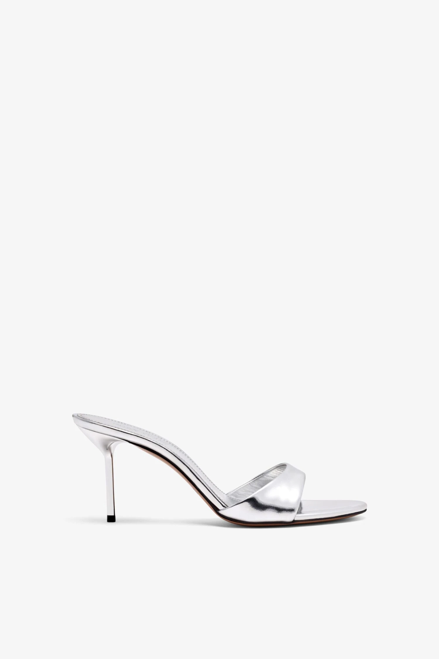 The Lidia mule in mirrored silver leather features a mid-height slender heel and open toe, making it a dawn-to-dark essential.