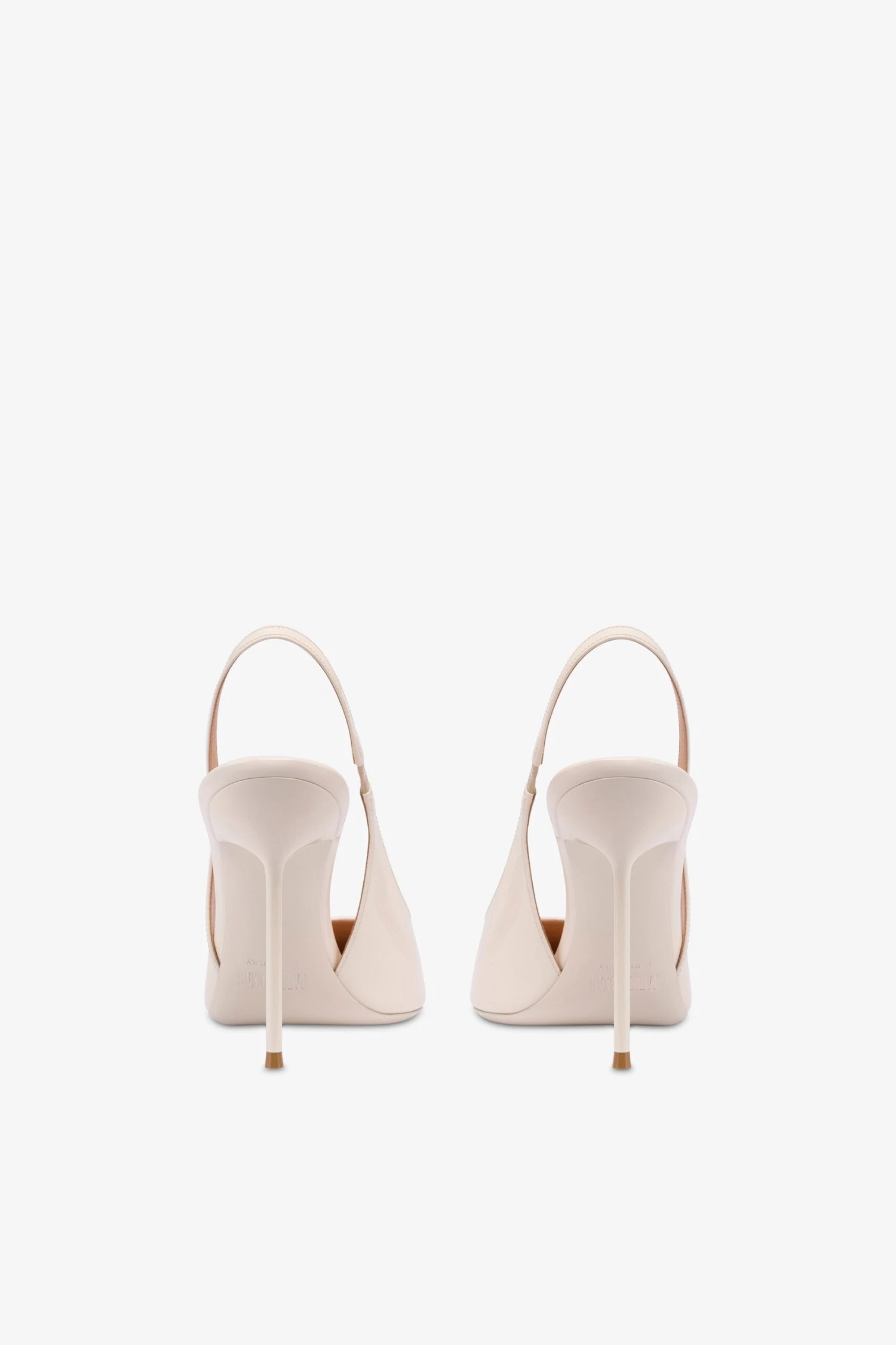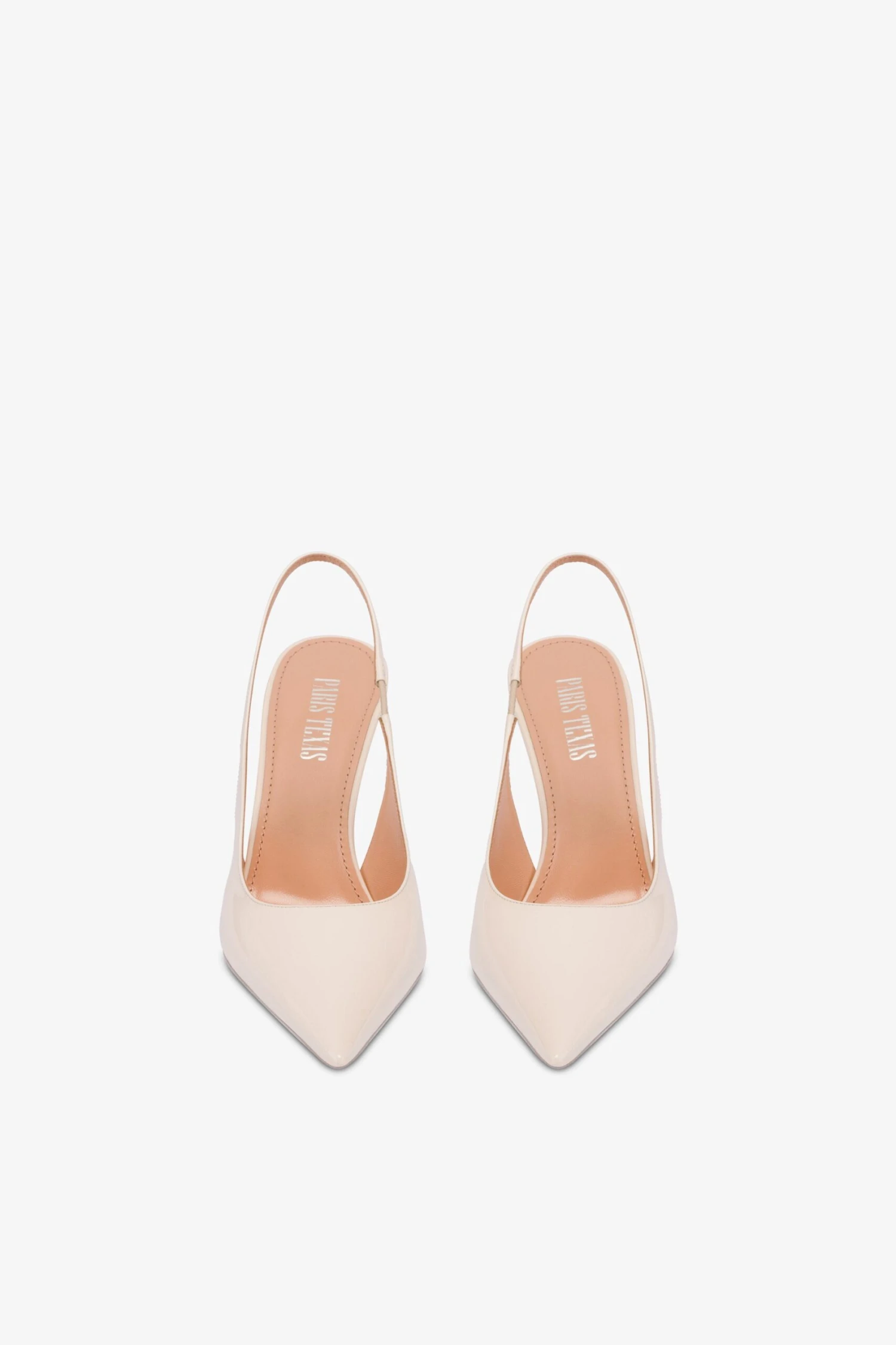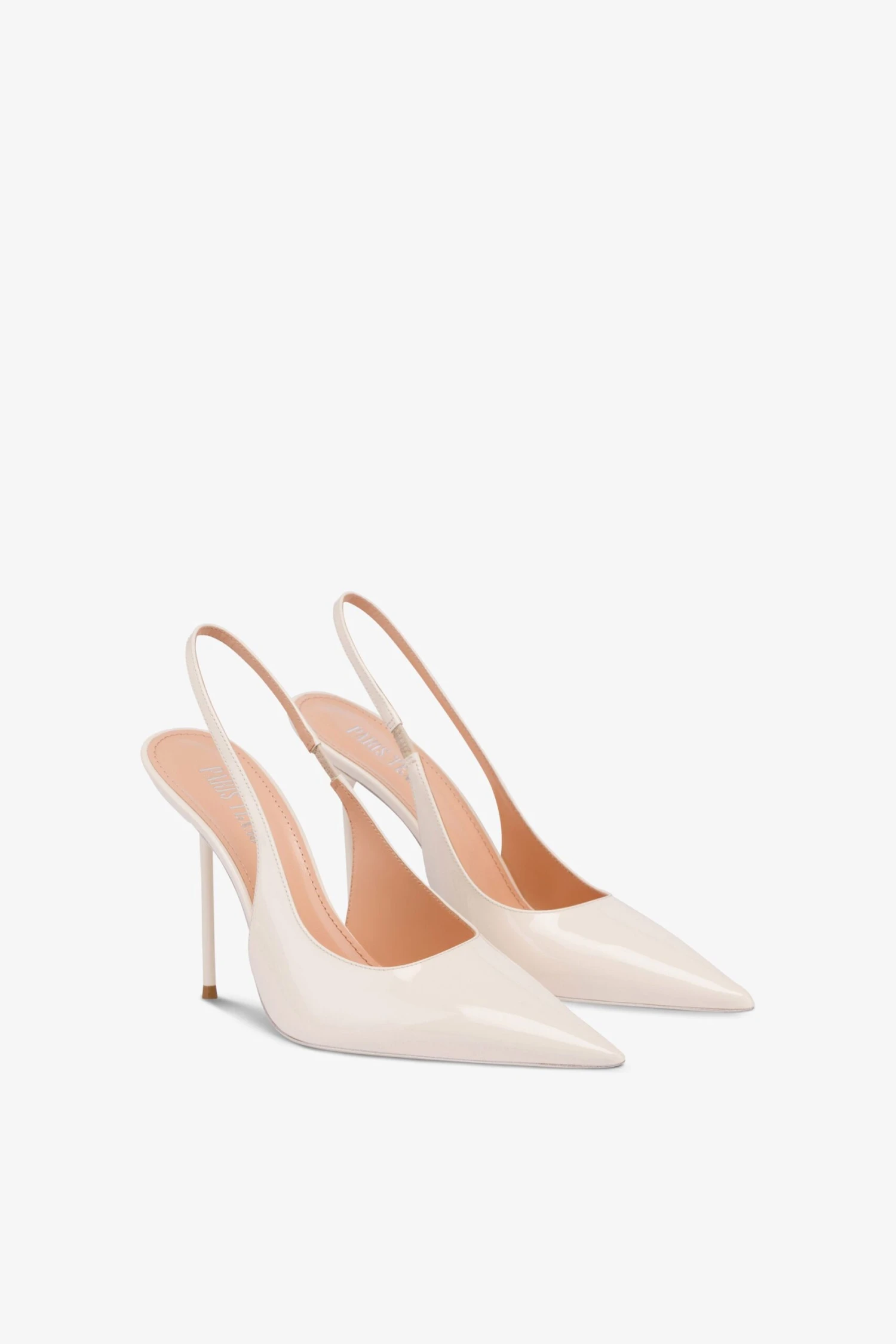 Pointed-toe slingbacks with a covered pin heel in ivory patent leather. Made in Italy.