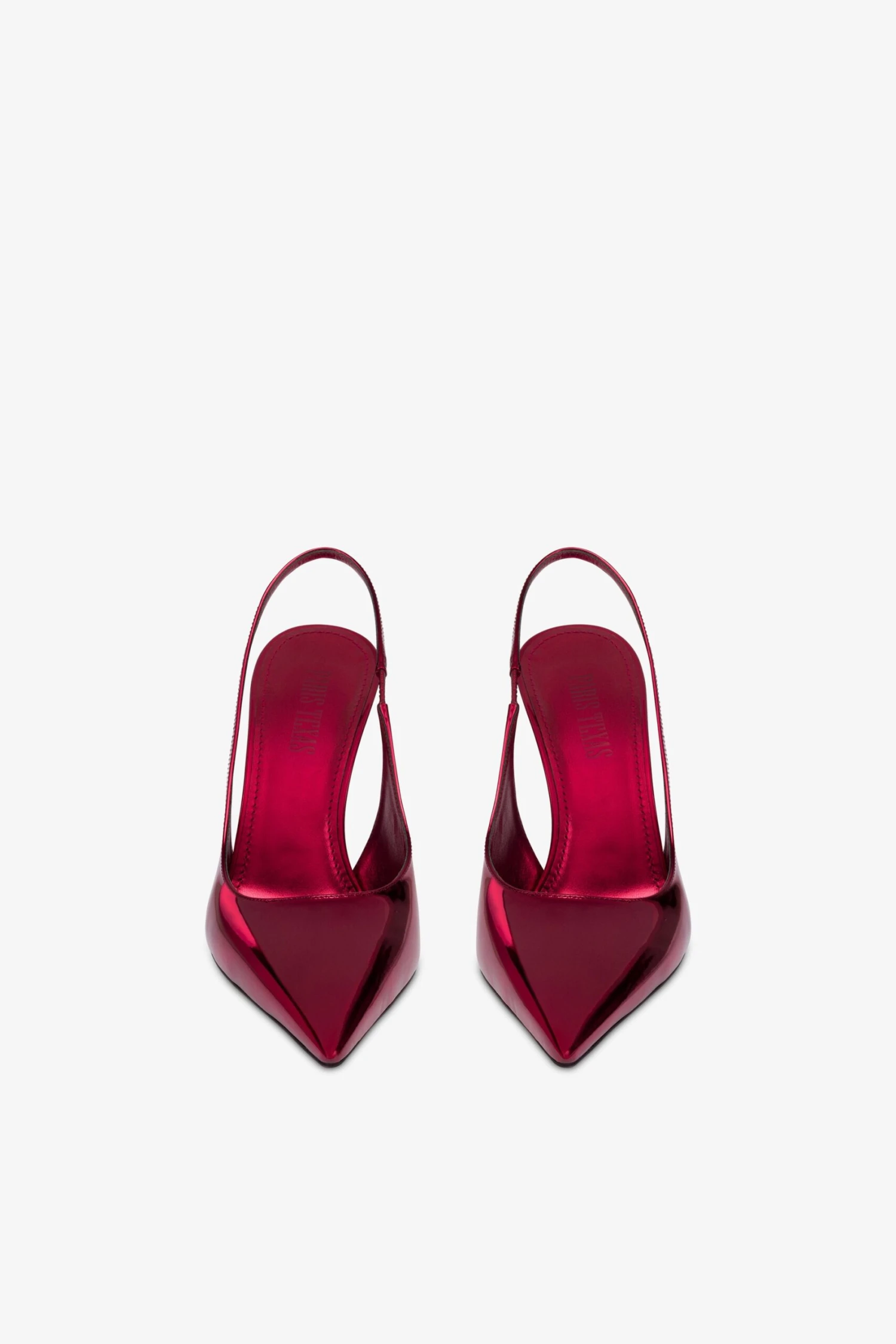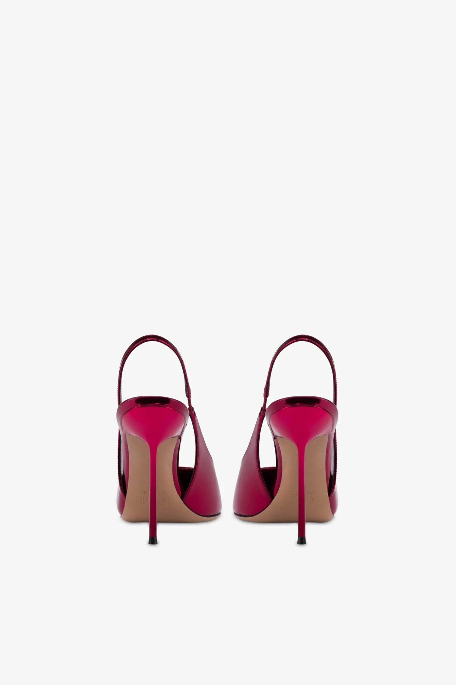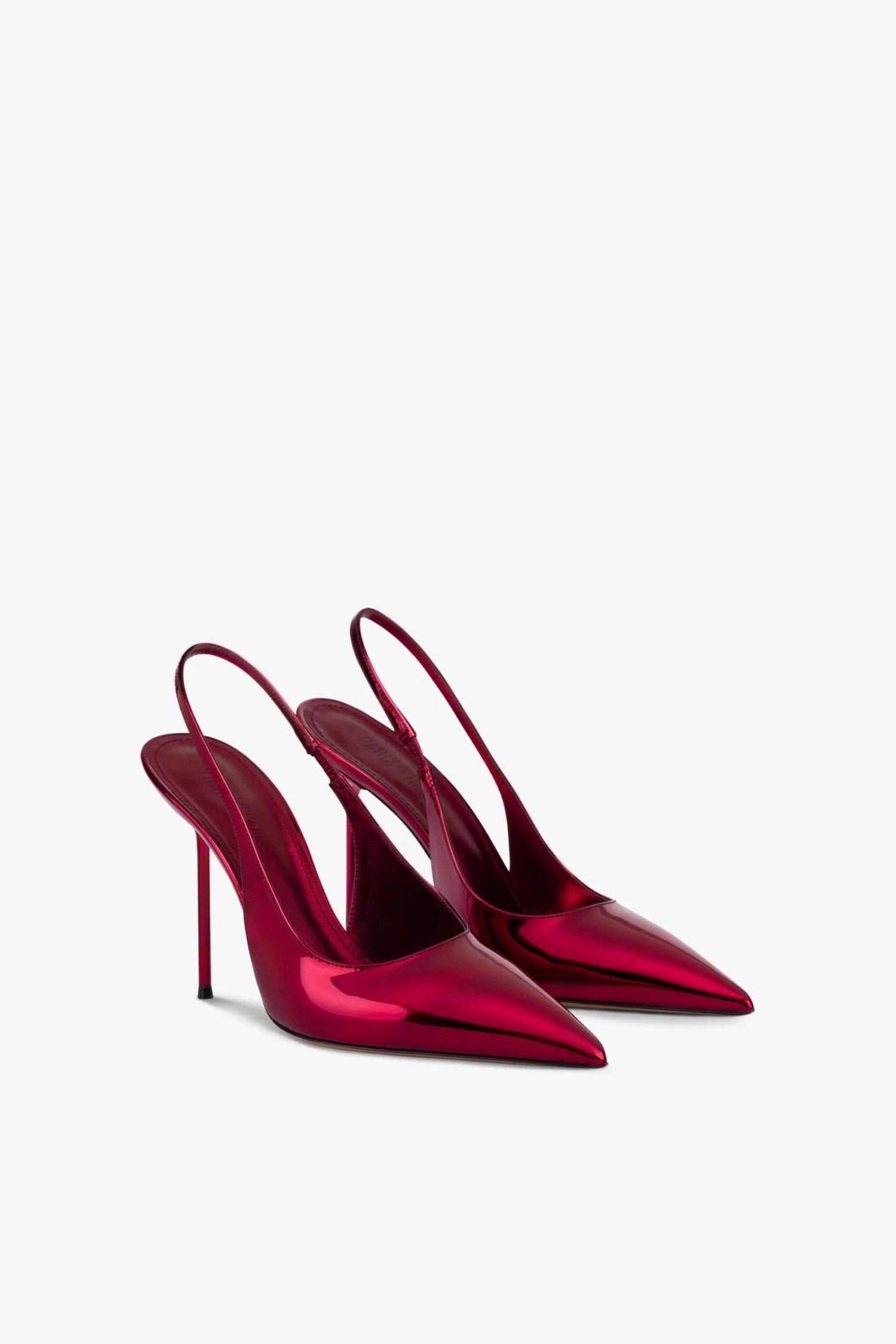 Pointed-toe slingbacks with a covered pin heel in red mirror-effect leather. Made in Italy.