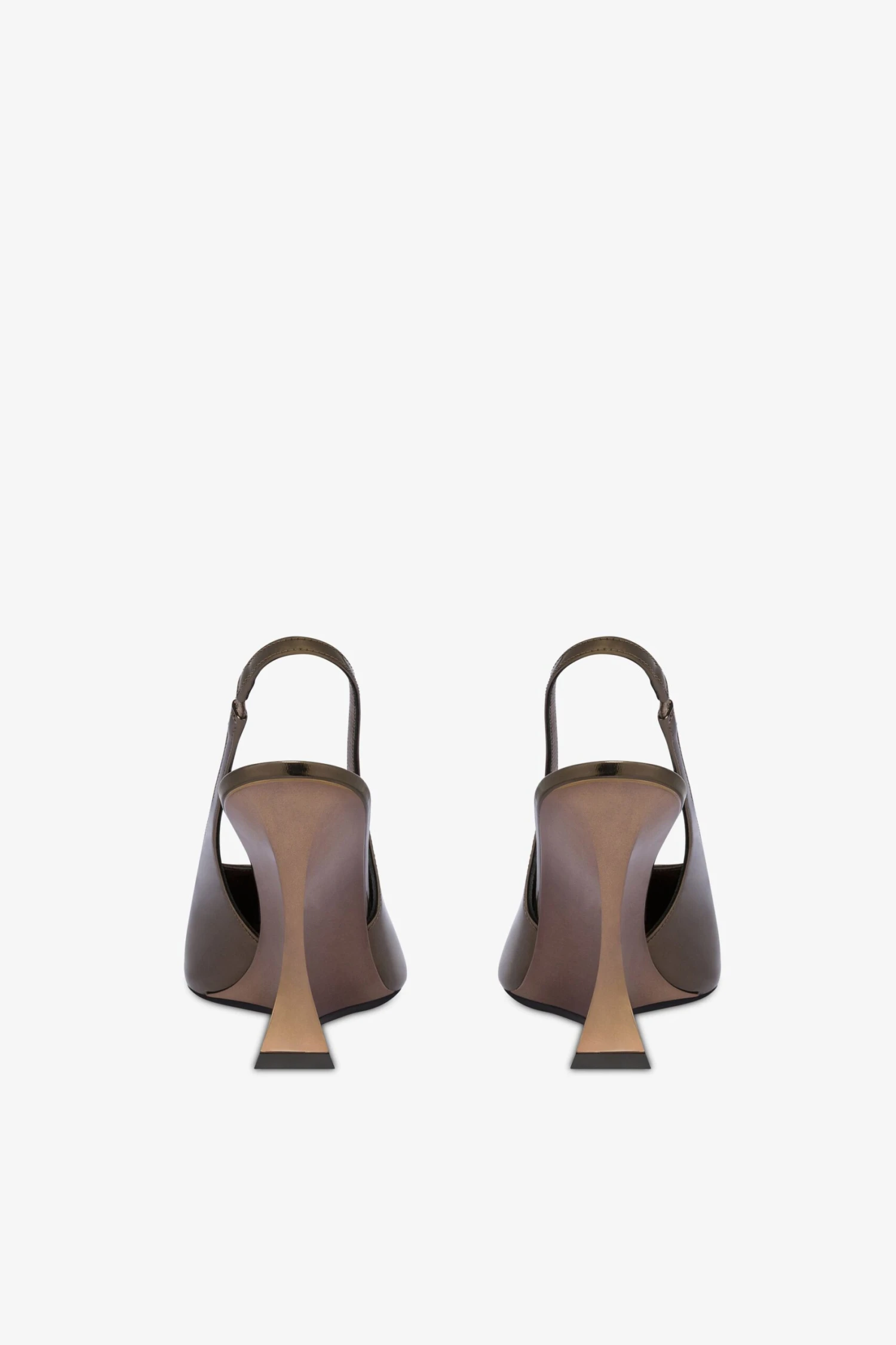 Pointed-toe slingbacks with a covered, curved wedge heel in safari-colored mirror-effect leather. Made in Italy.