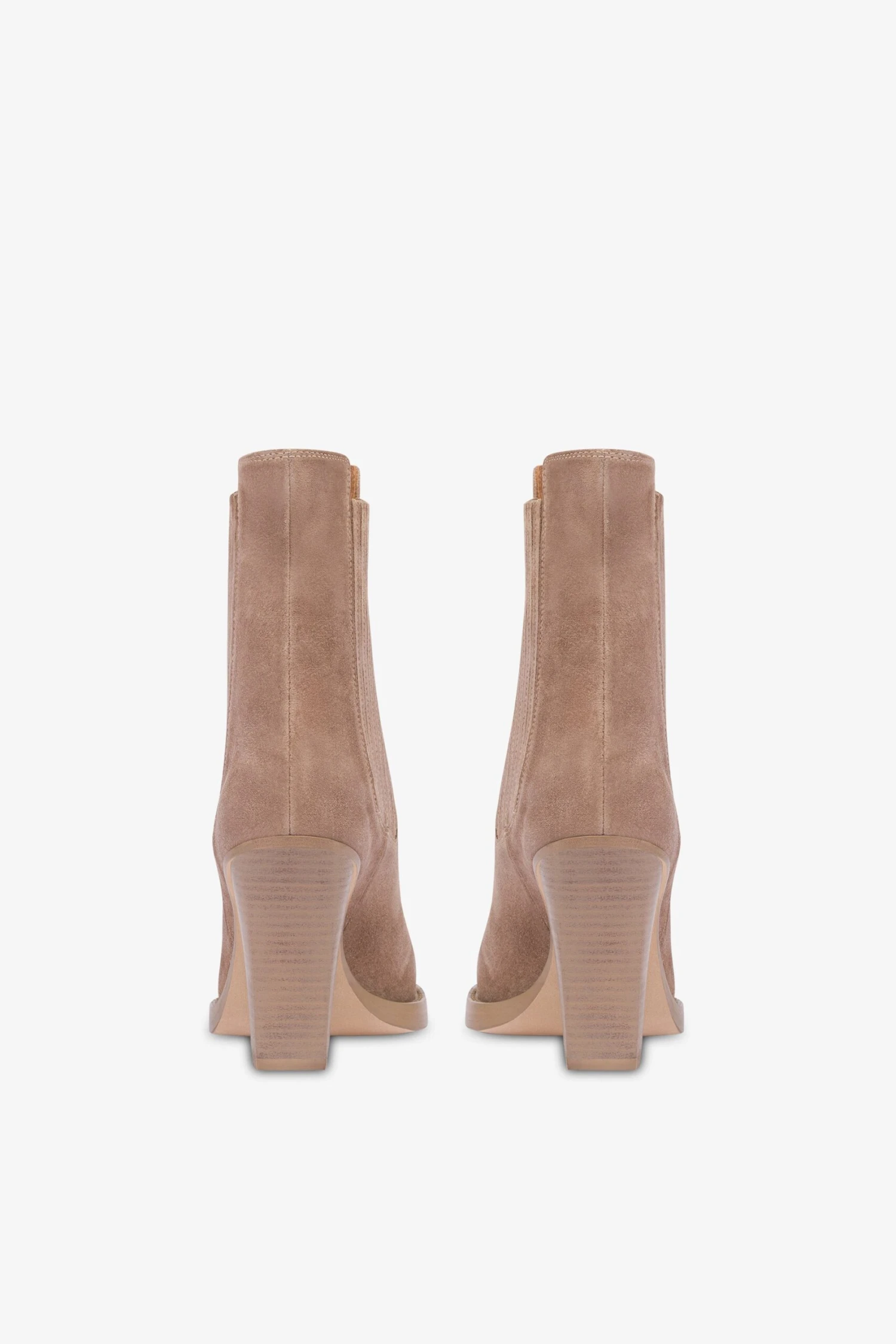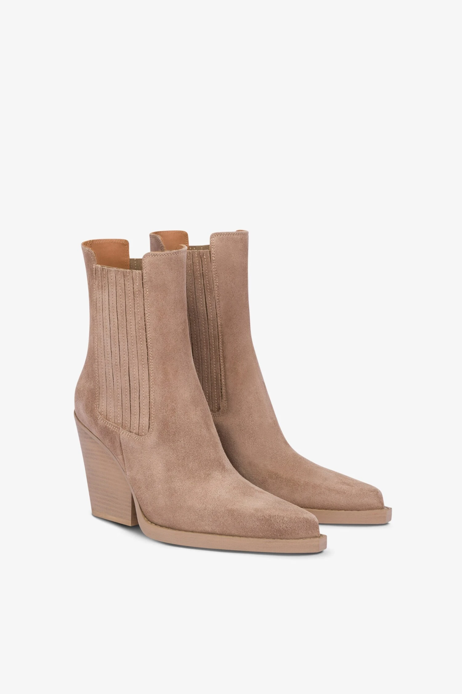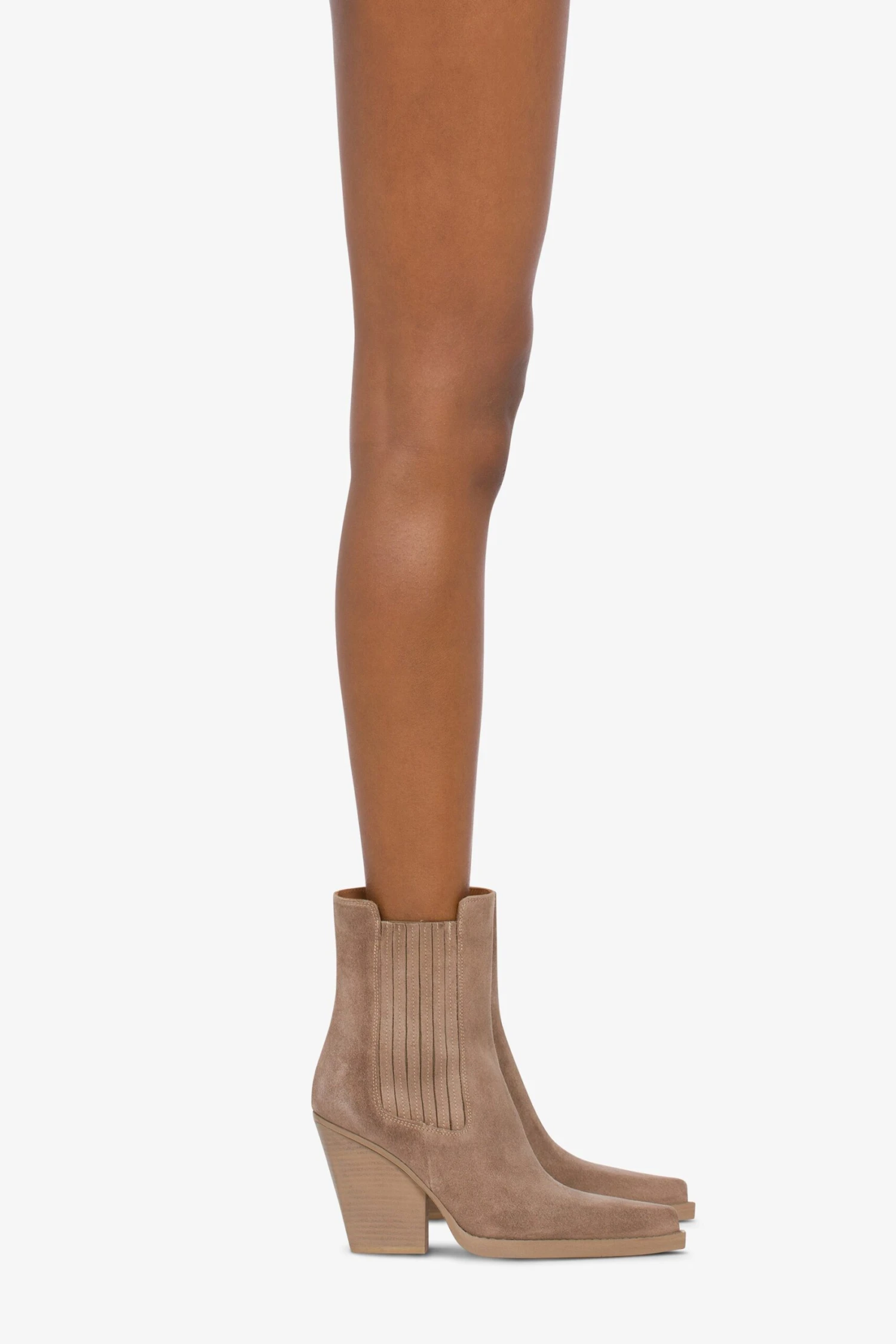 Ankle boots with a square pointed toe set atop a medium square heel featuring side inserts. Available in a koala suede version. Made in Italy from soft leather.