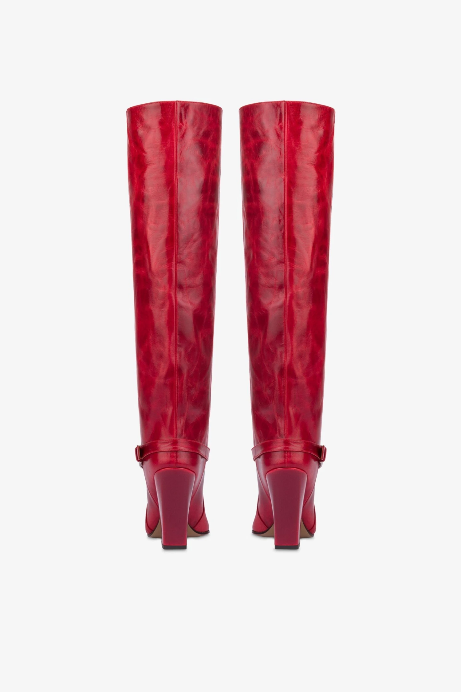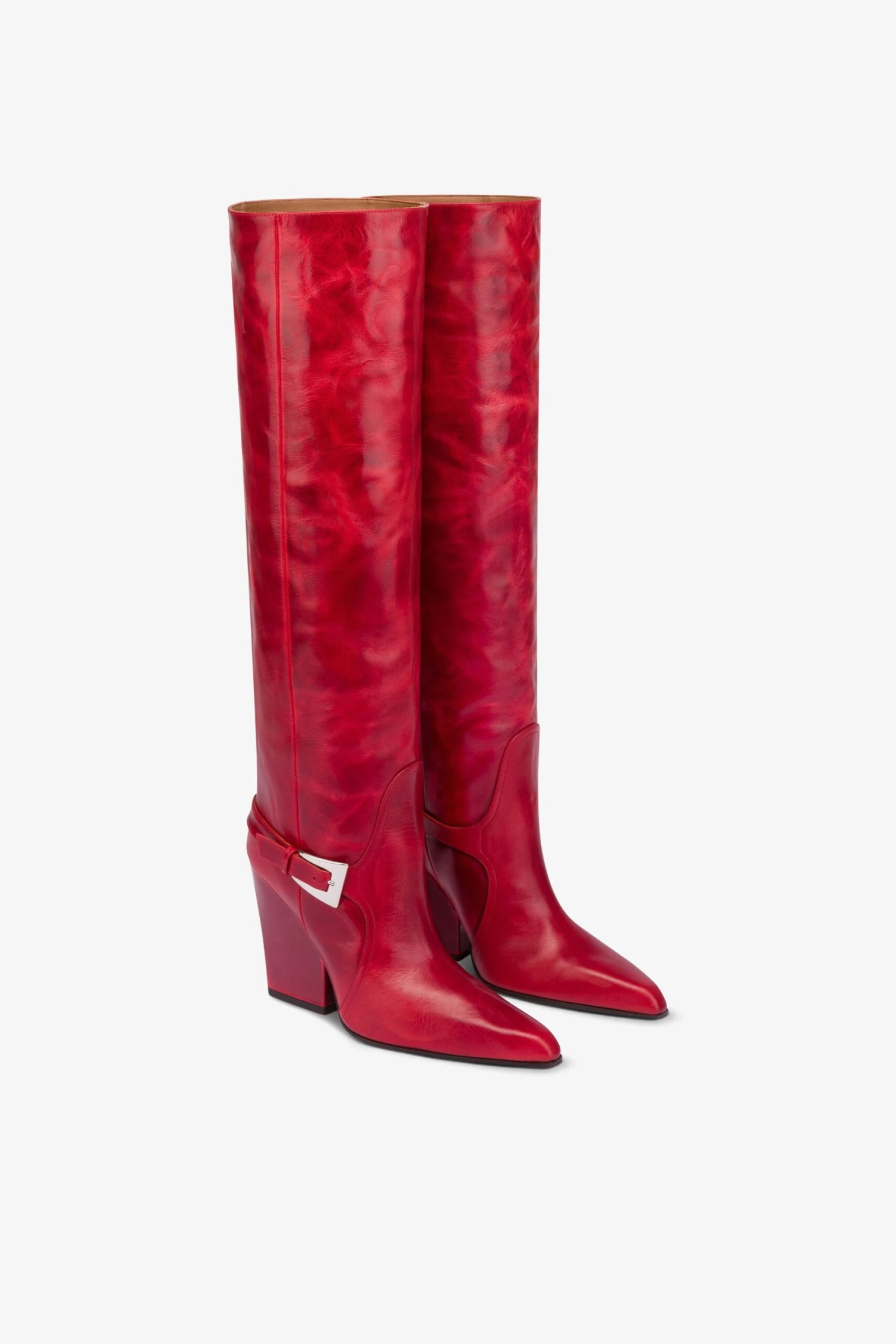 Tall, knee-high boots with a pointed toe set atop a medium walking heel. Available in a shiny fiesta vintage leather version decorated with a buckle at the ankle. Made in Italy from soft leather.