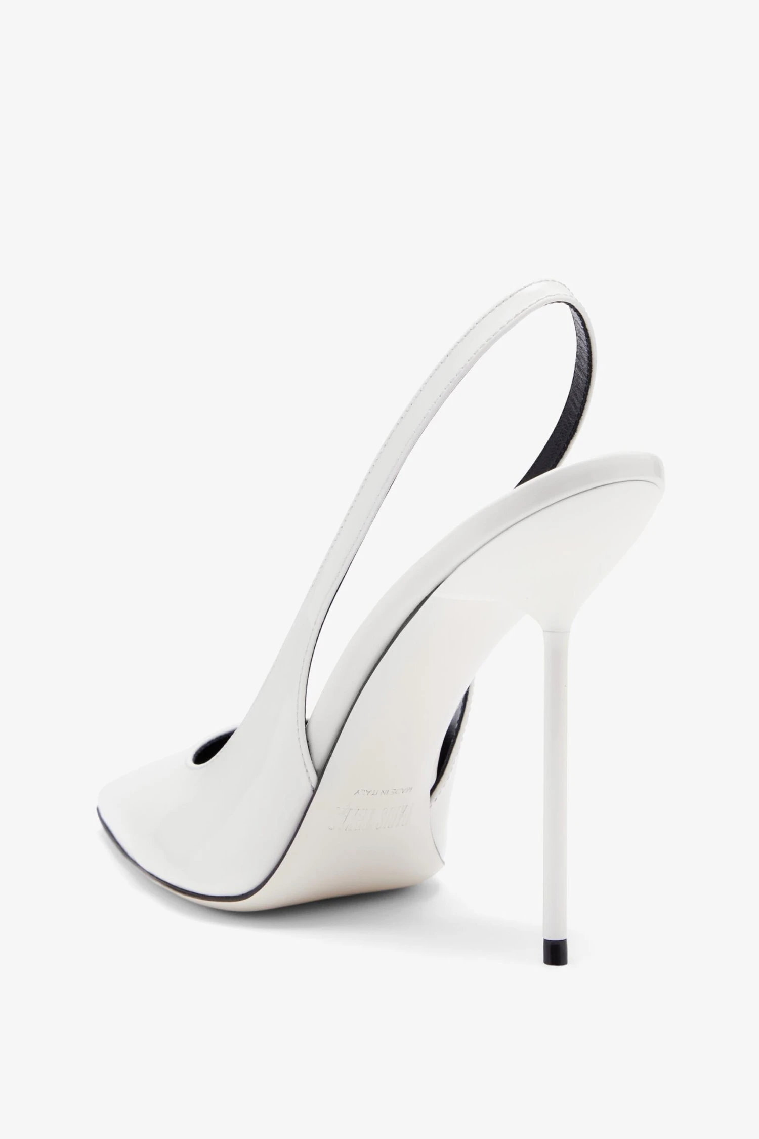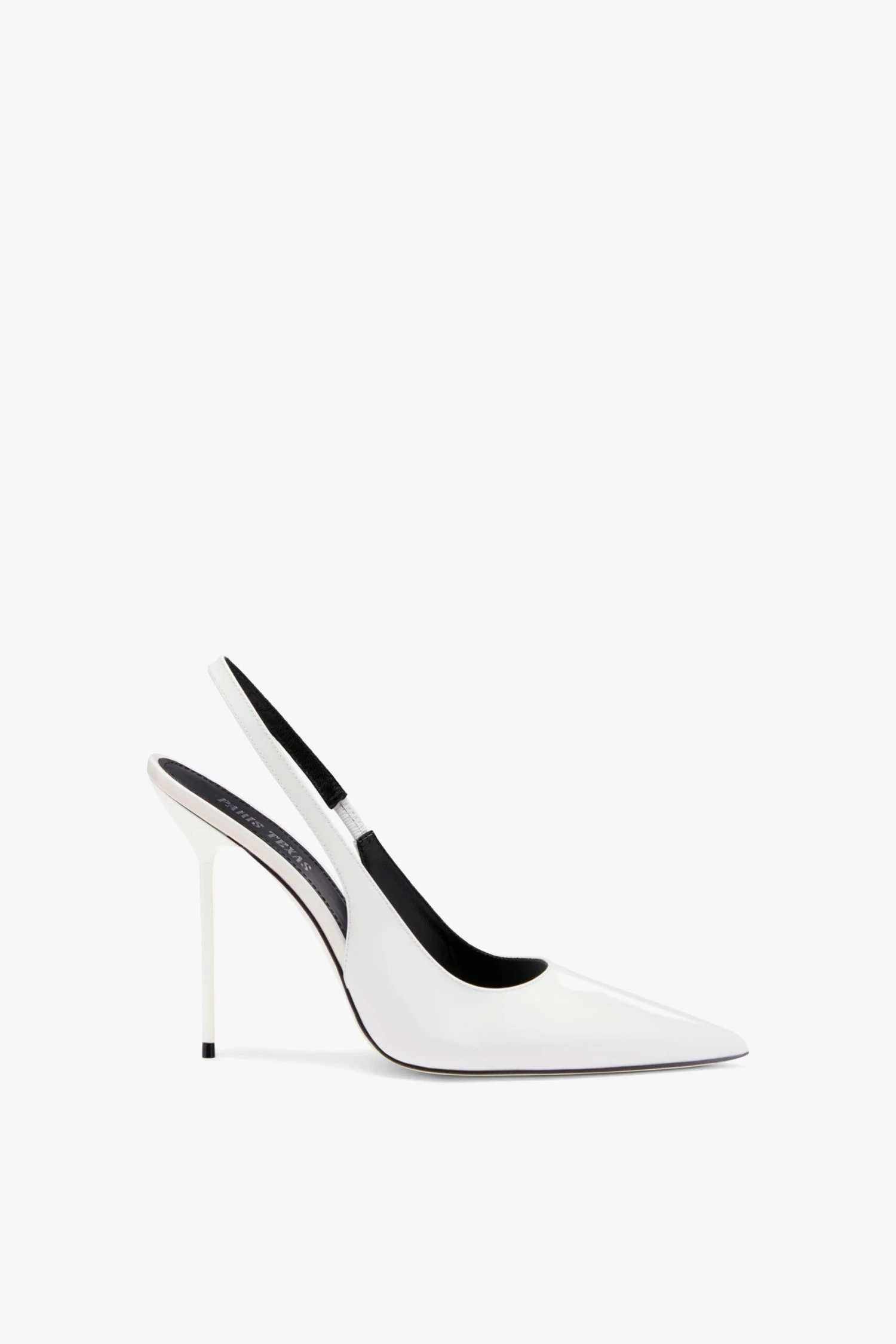 Chic and ladylike, the Lidia slingback pumps can be worn day and night. Crafted from luminous patent leather in a bright white hue, they have a sleek pointed toe, a low-cut vamp and a supportive back strap. They’re set on a 105 mm ultra-thin stiletto heel that magically elongates the leg.