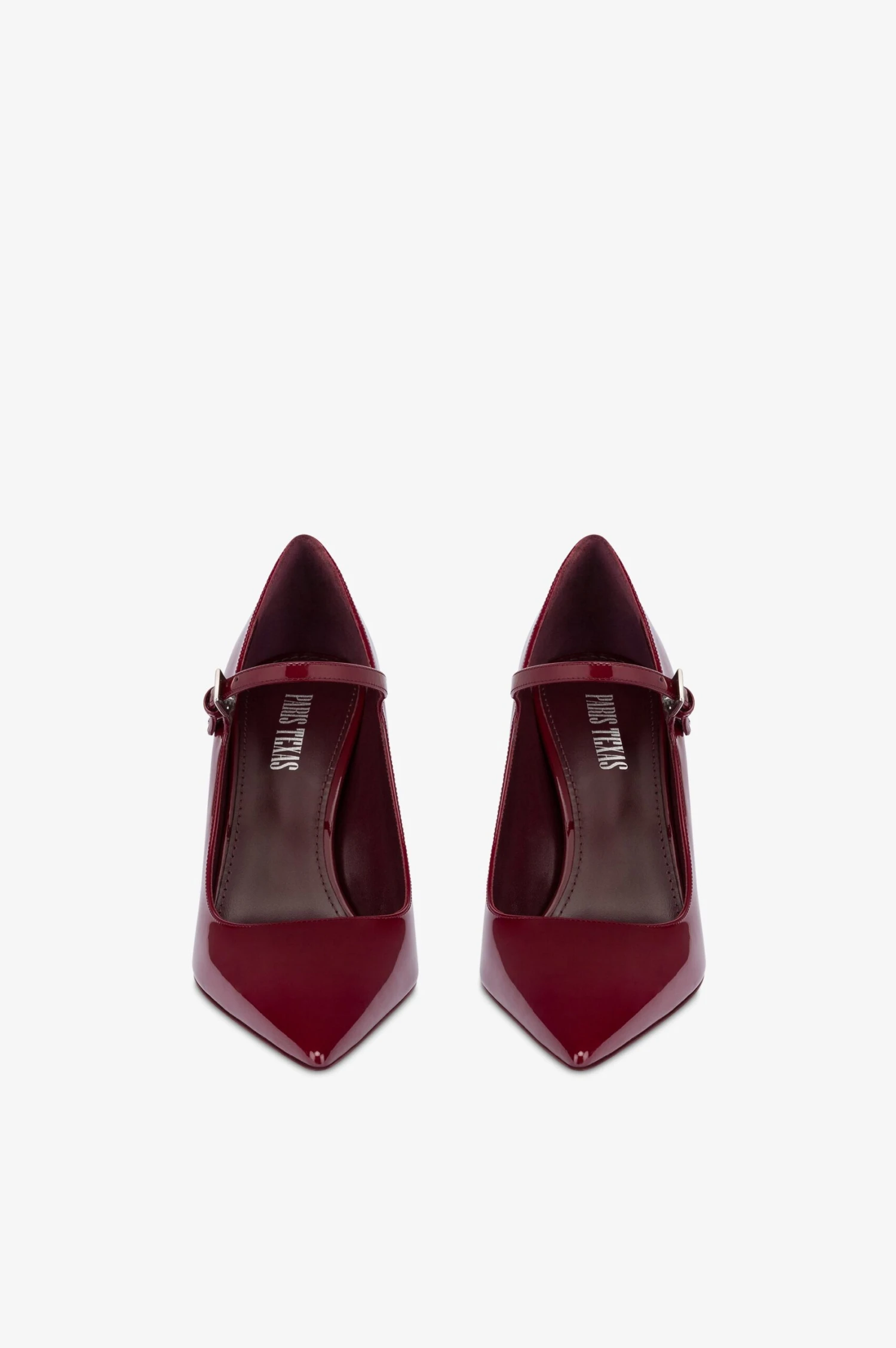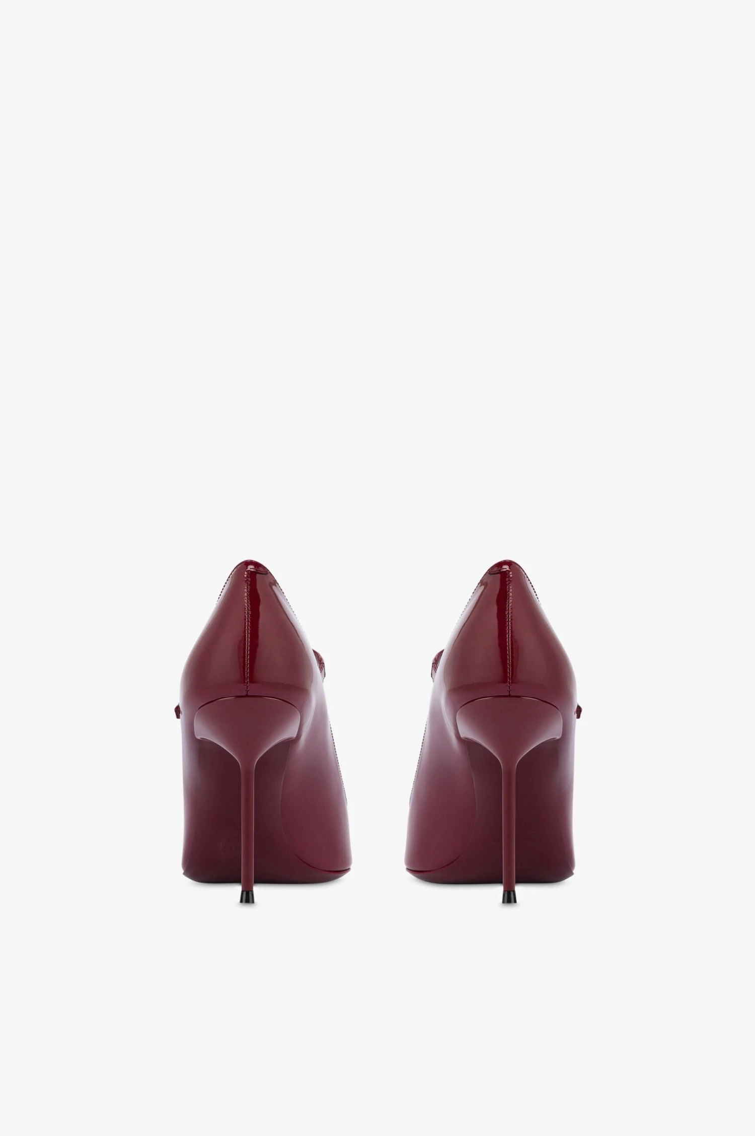 Pointed-toe pumps in rouge noir patent leather with a front strap. Covered pin heel. Made in Italy.
