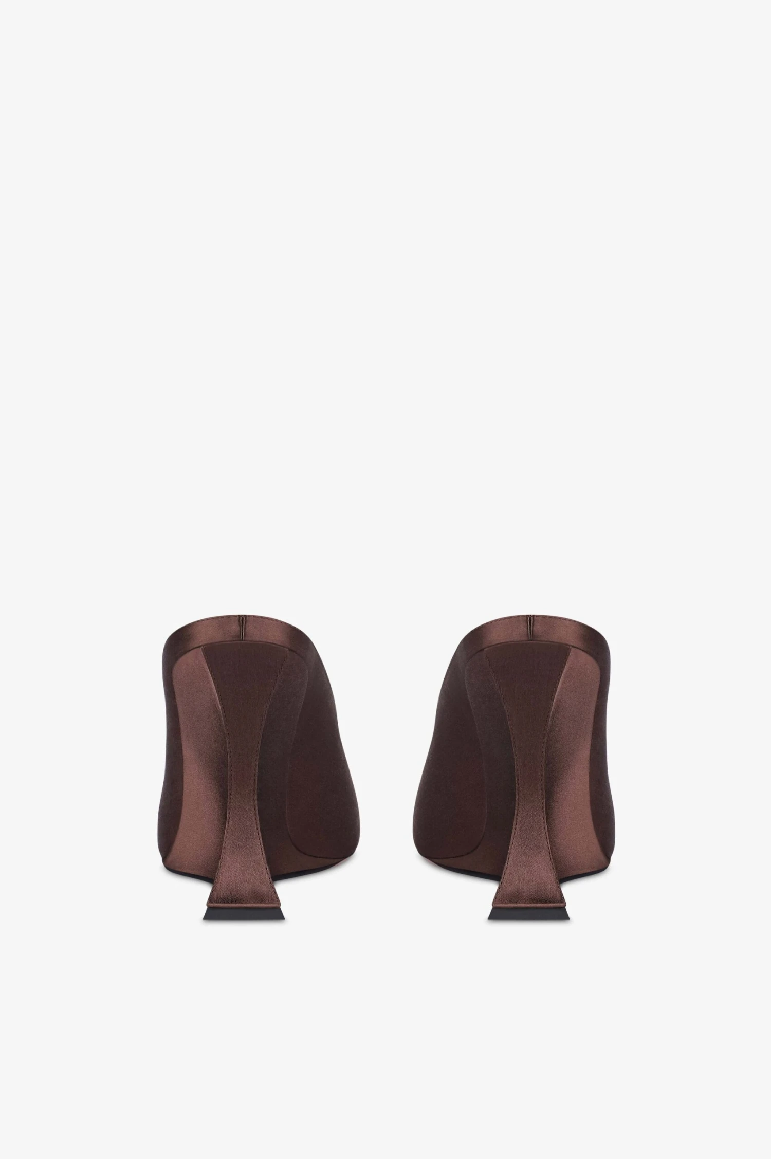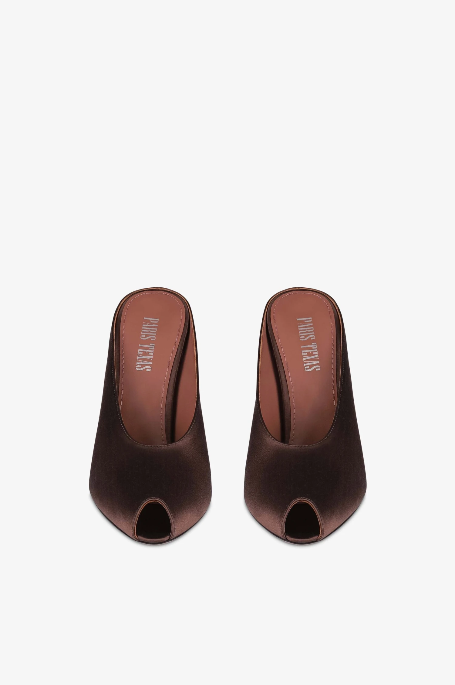 Open-toe sabots in ebony satin. Covered wedge heel. Maade in Italy