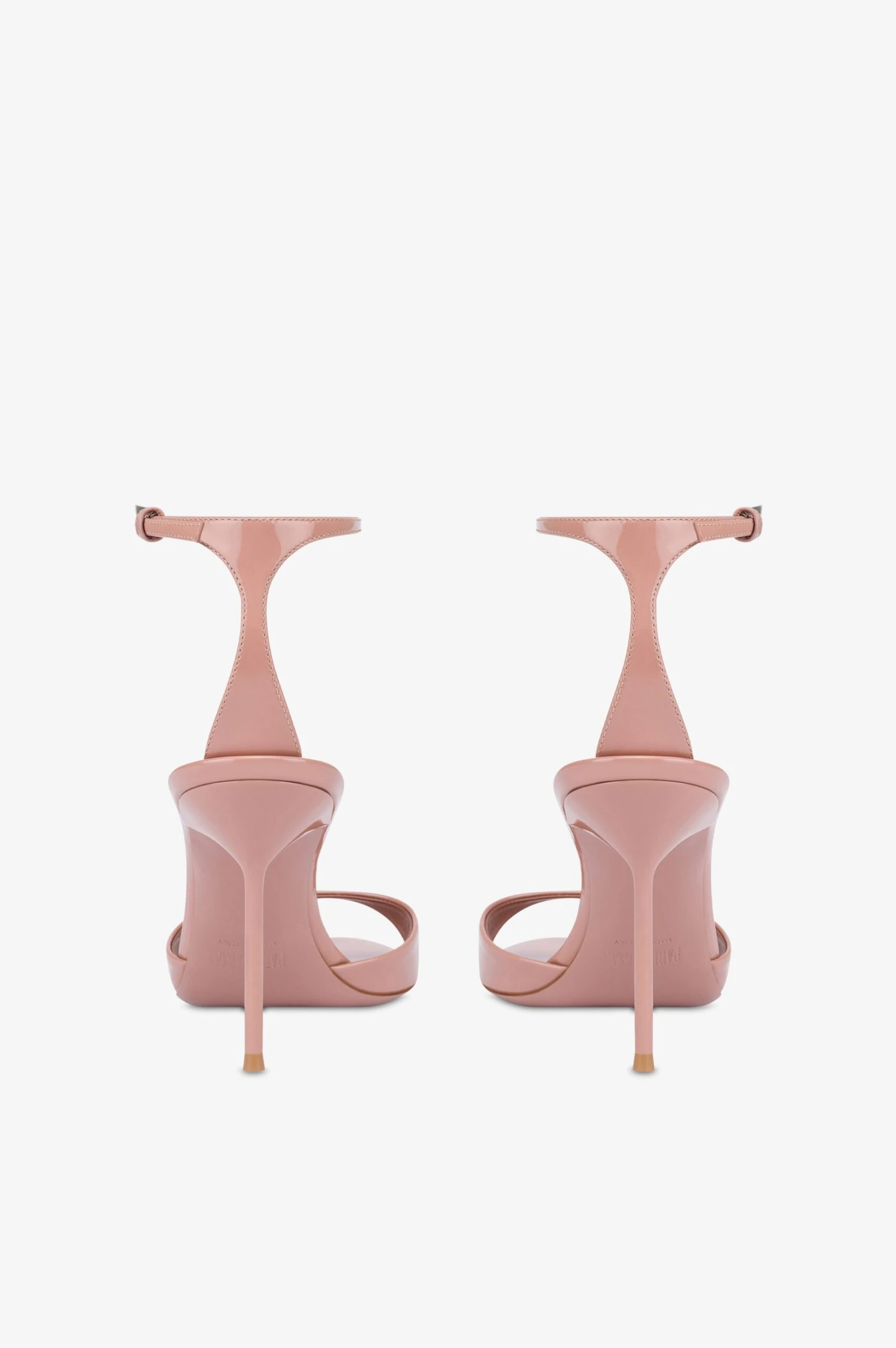 Sandals in dark phard patent leather with an ankle strap. Covered pin heel. Made in Italy.