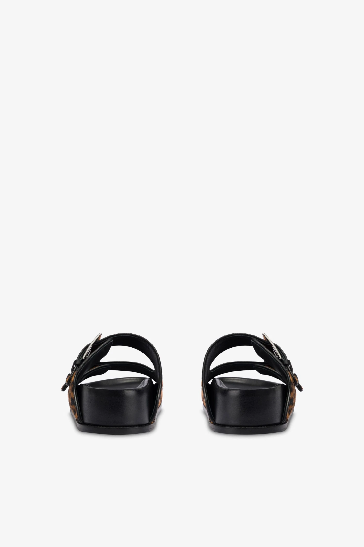 Flat sandals with two buckles in orange leopard-print cowhide. Made in Italy.