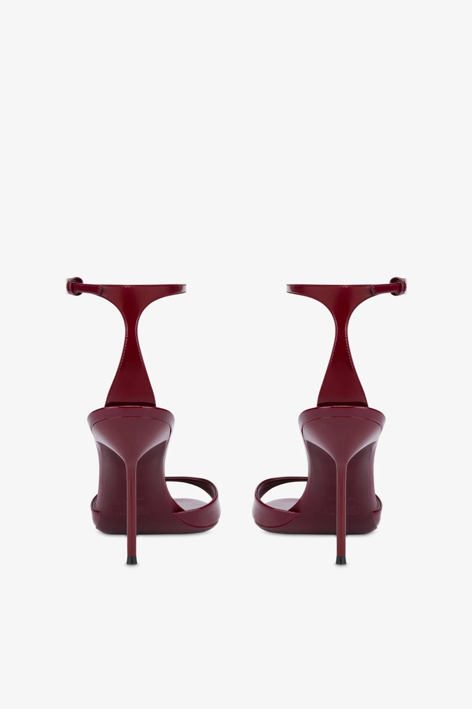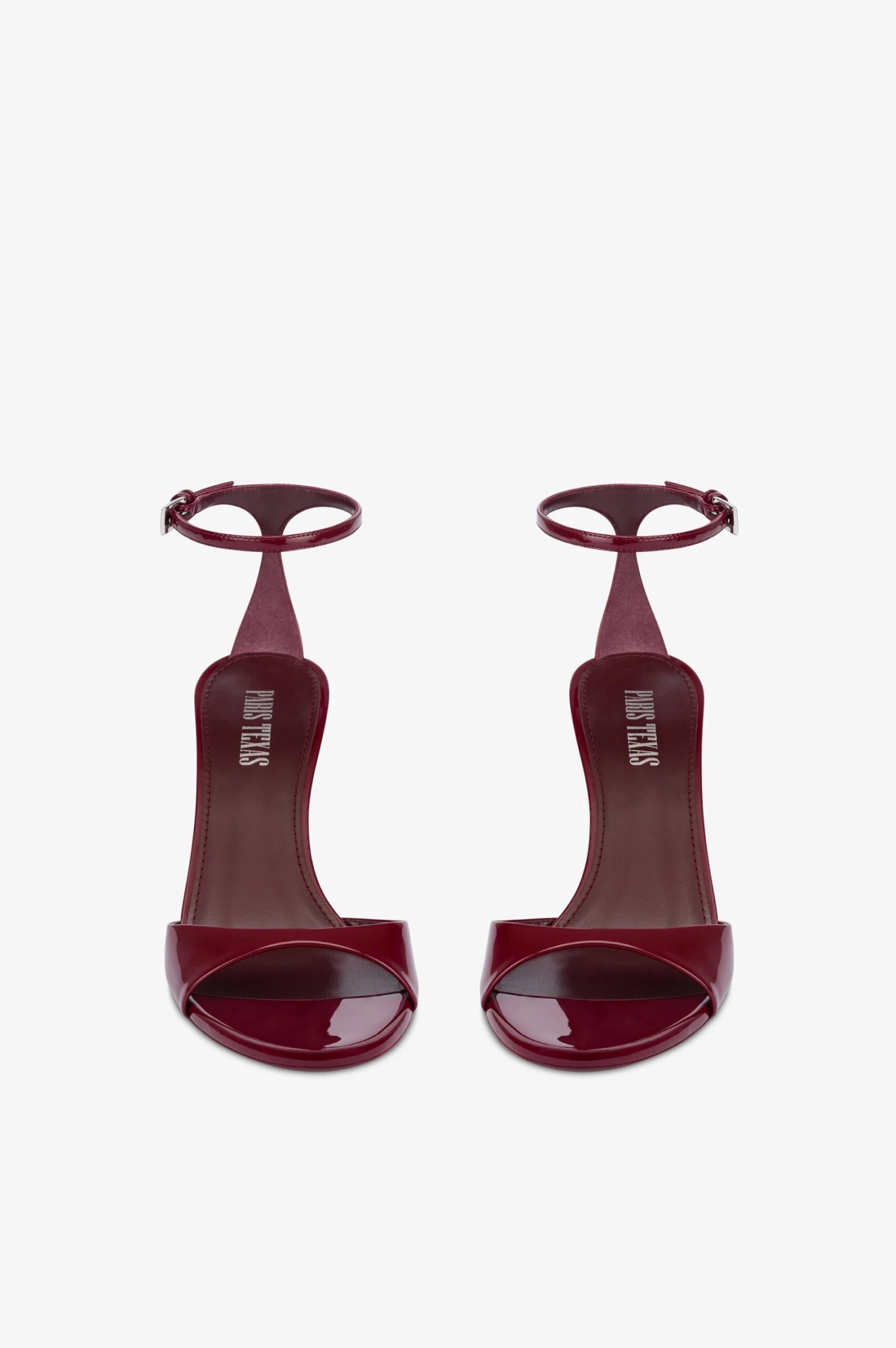 Sandals in rouge noir patent leather with an ankle strap. Covered pin heel. Made in Italy.
