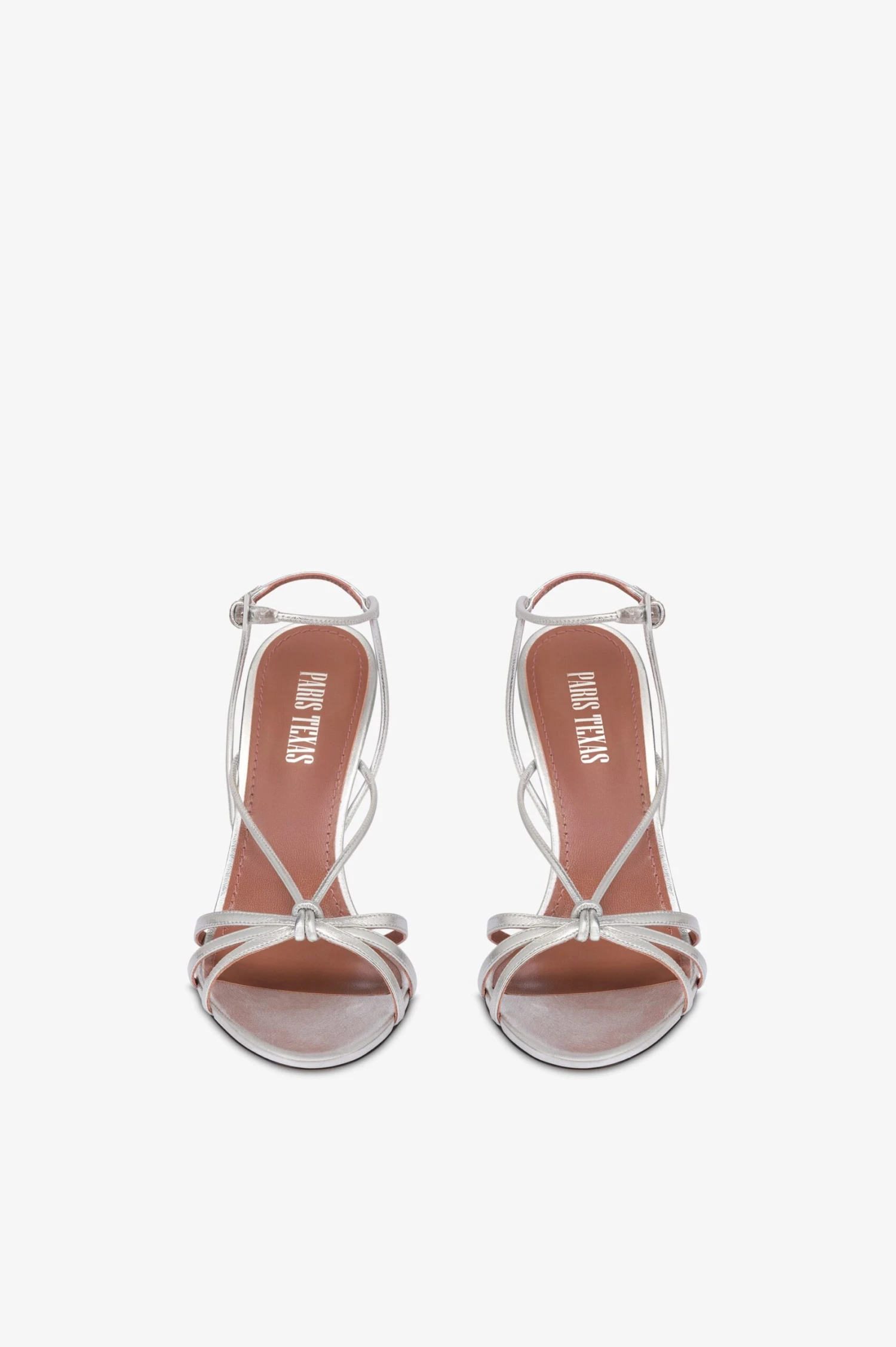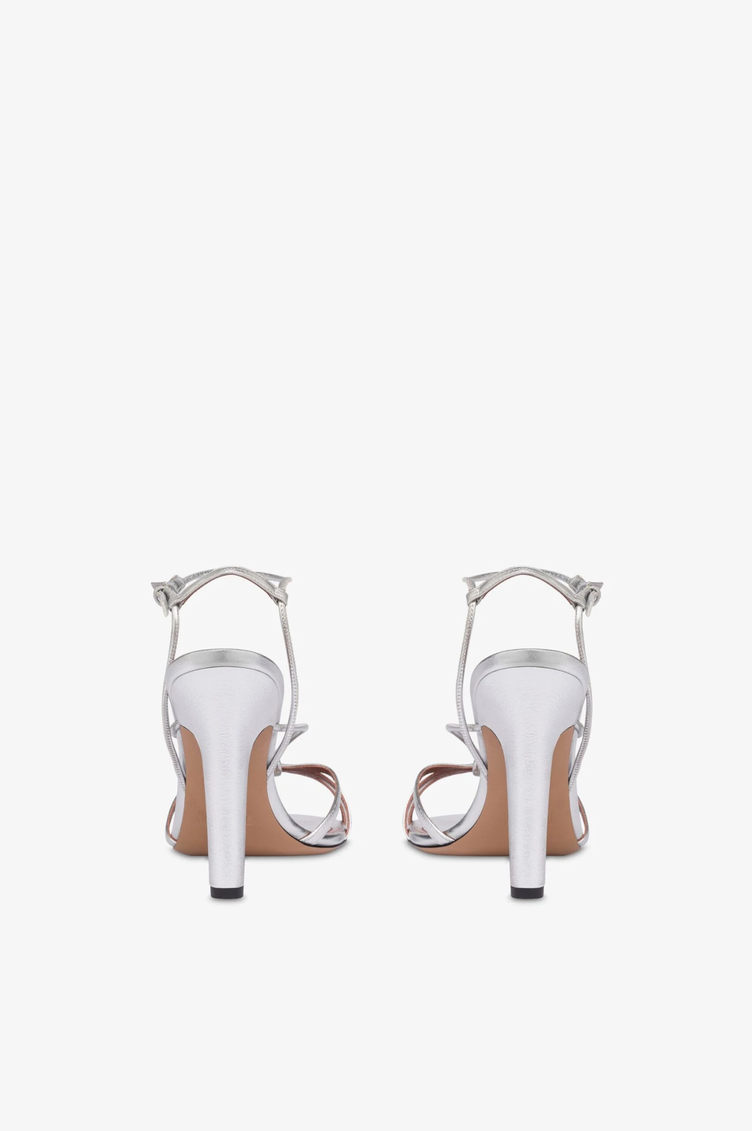 Sandals with an ankle strap and covered chunky heel in silver leather. Made in Italy.