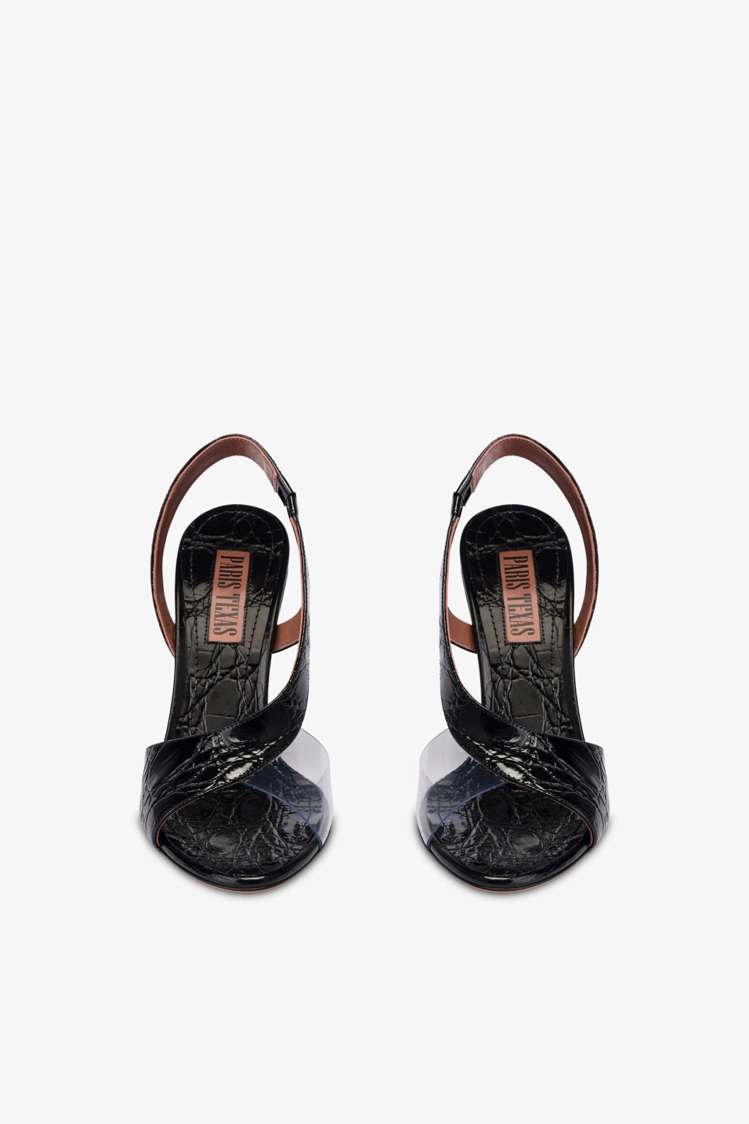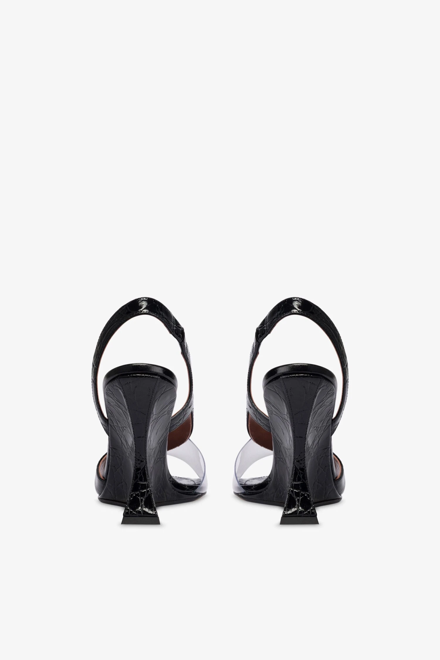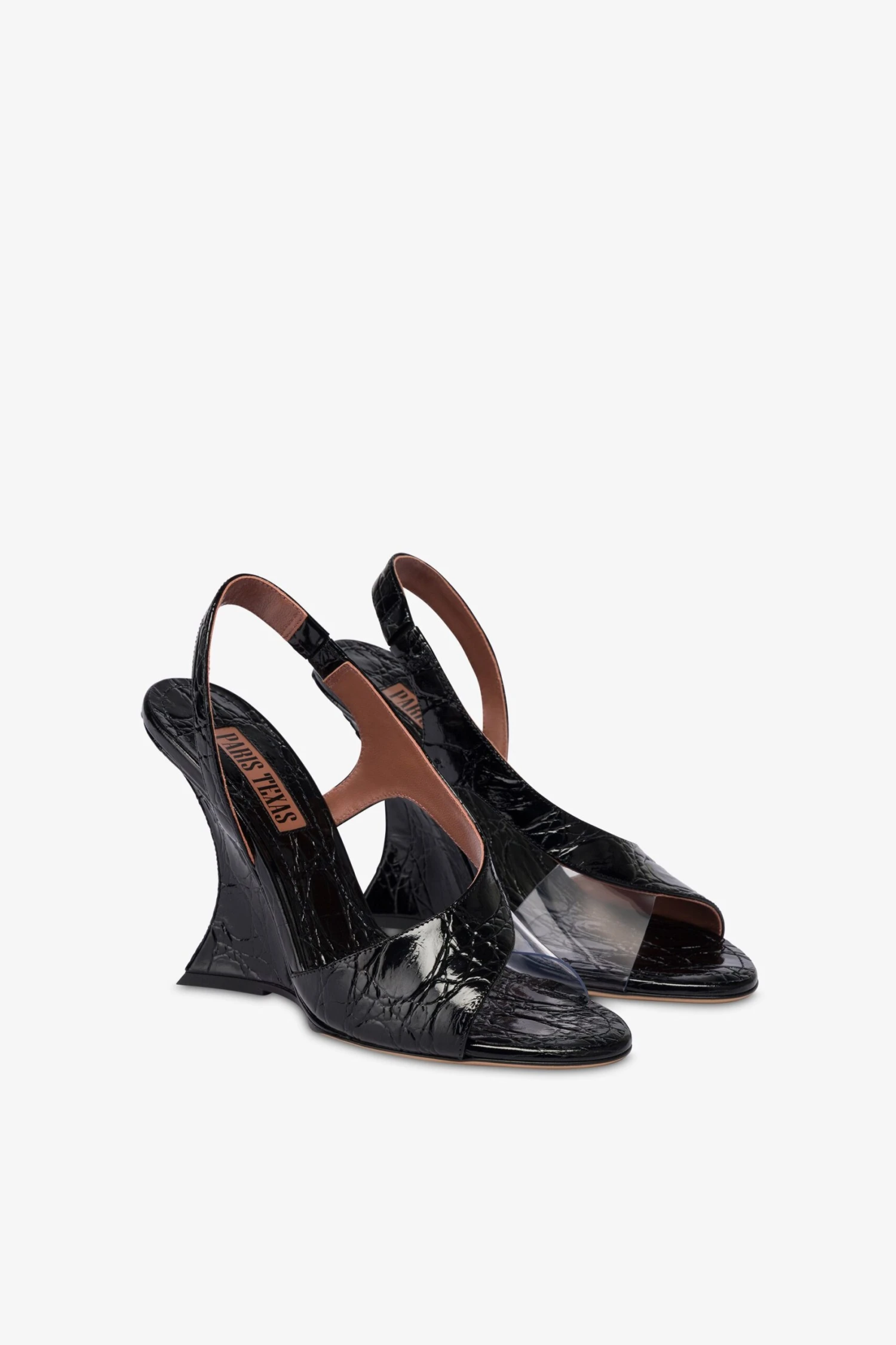 Open-toe slingbacks with a covered curved wedge heel in black PVC and croco-embossed leather. Made in Italy.