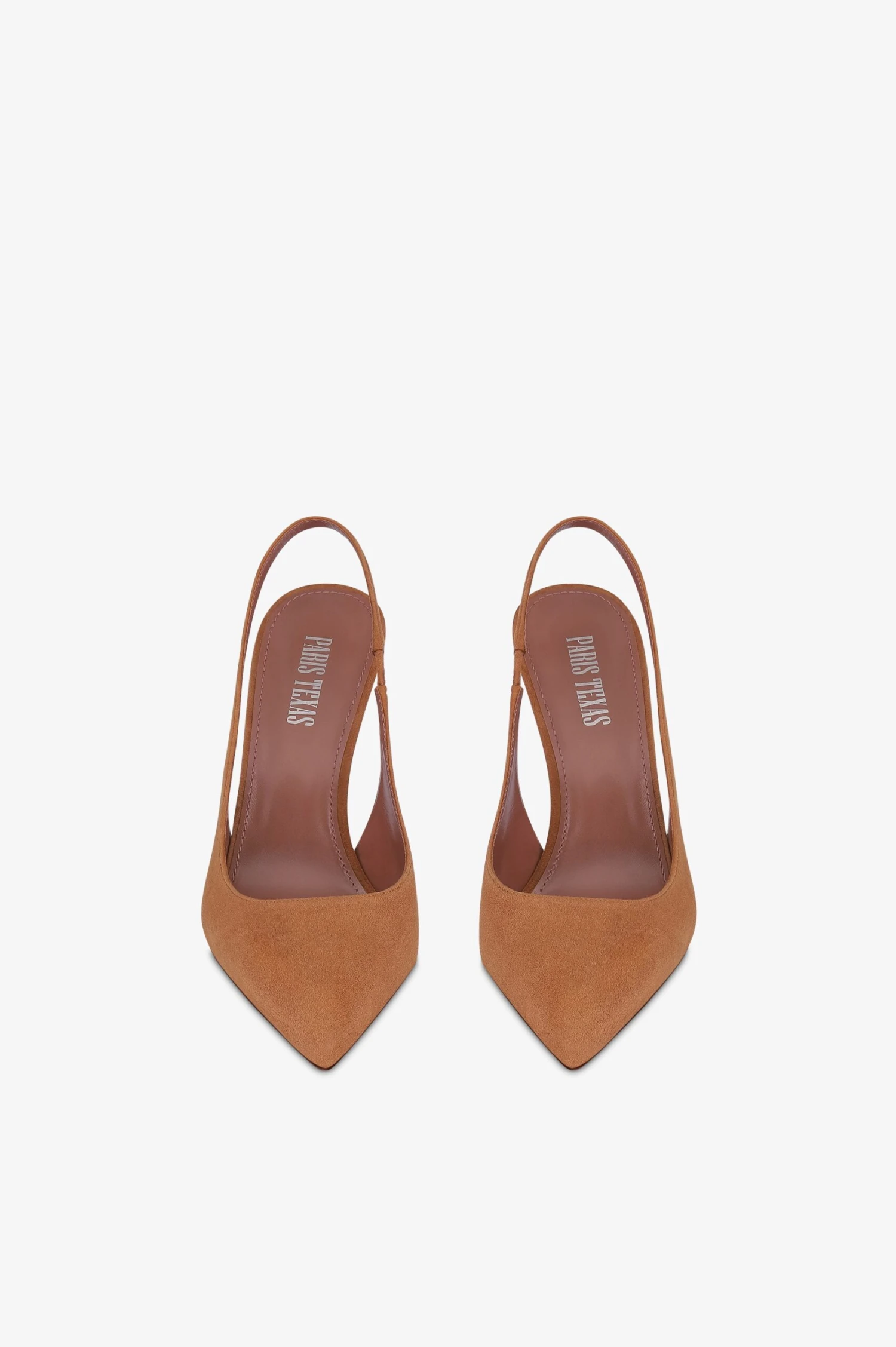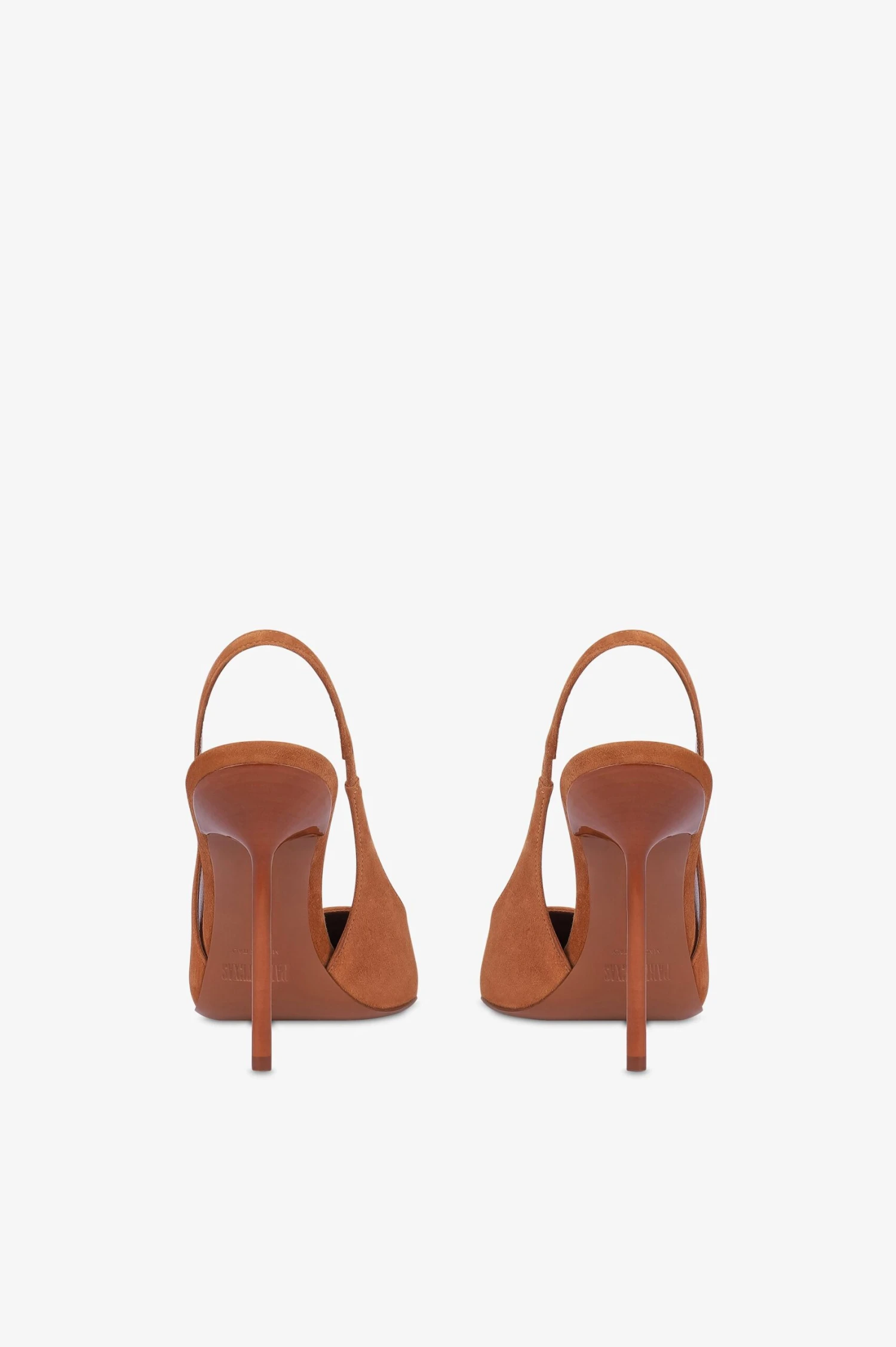 Pointed-toe slingbacks in cognac suede leather. Covered pin heel. Made in Italy.