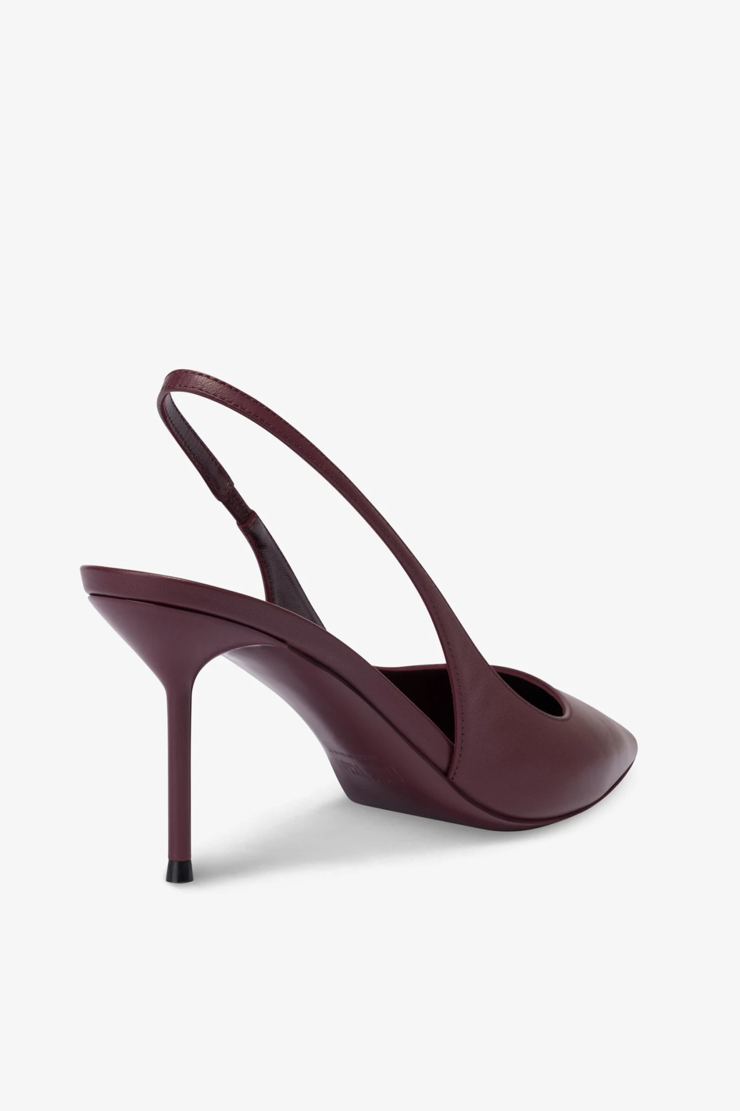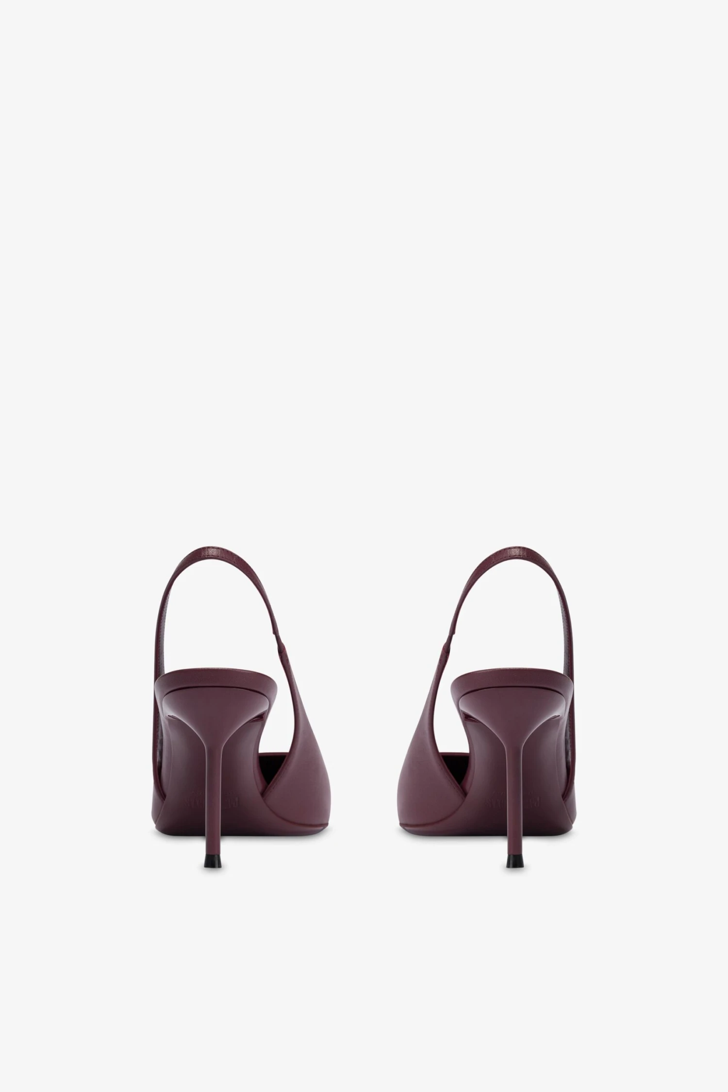Pointed-toe slingbacks with a covered pin heel in rouge noir leather. Made in Italy.