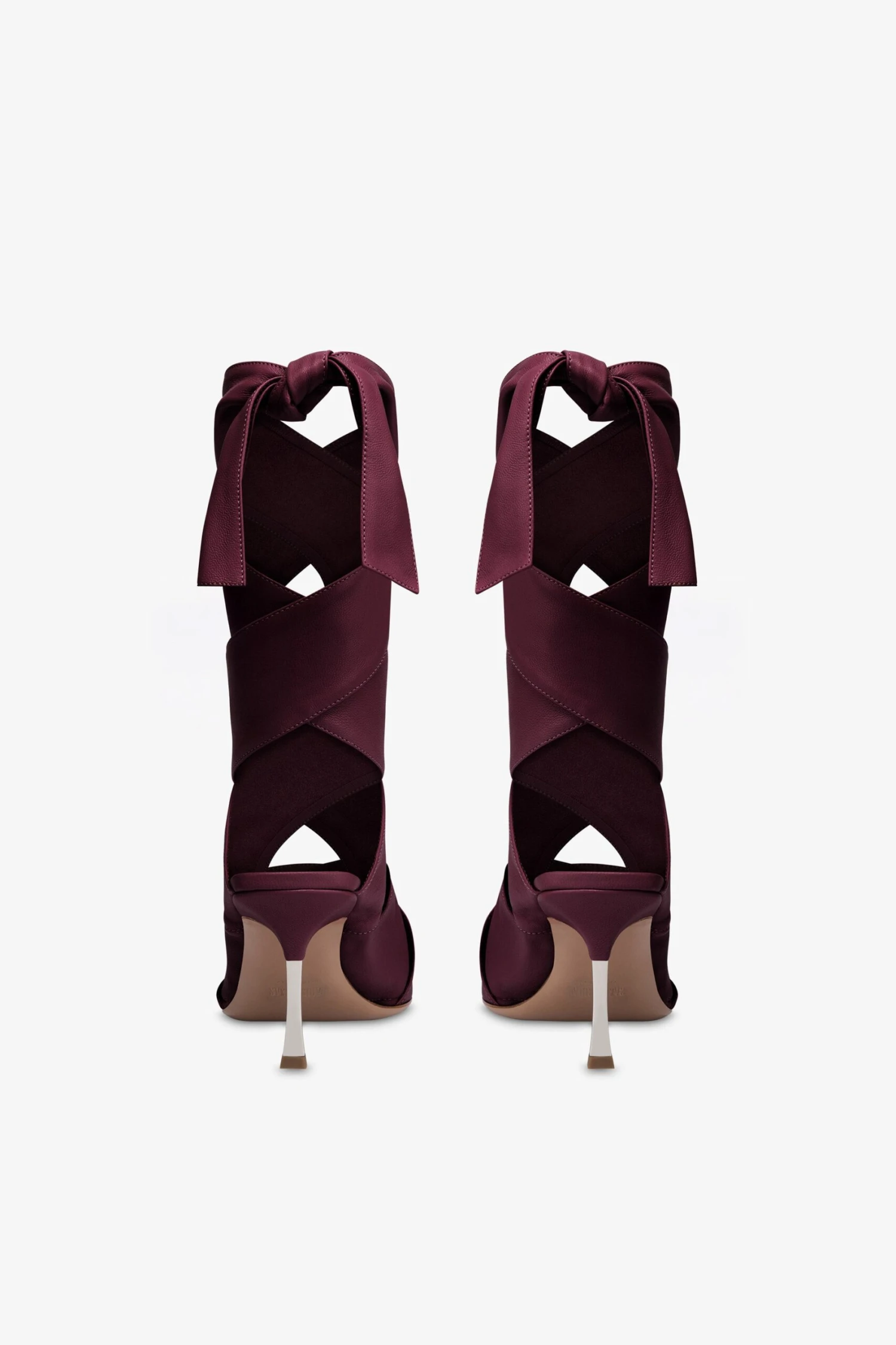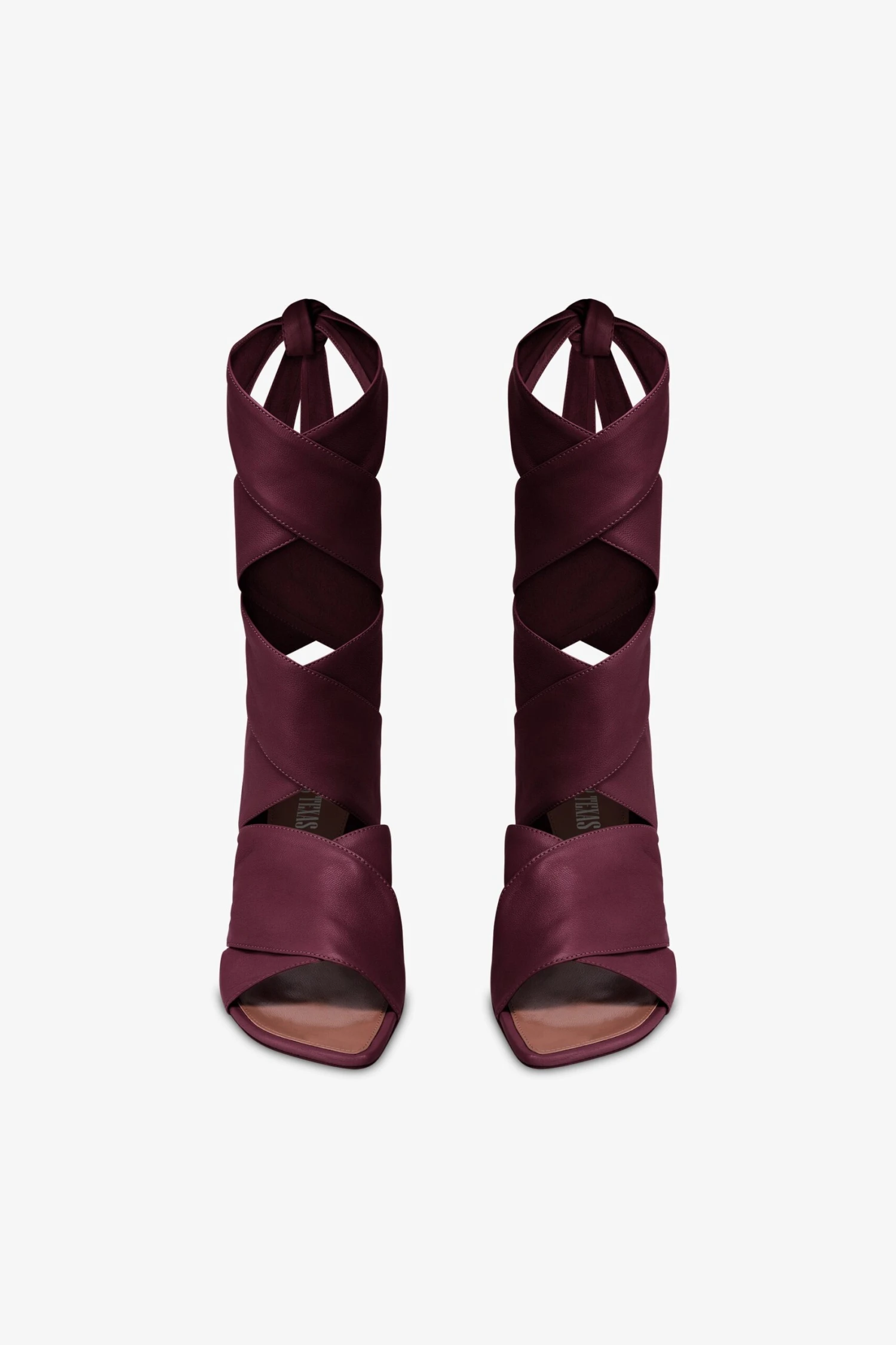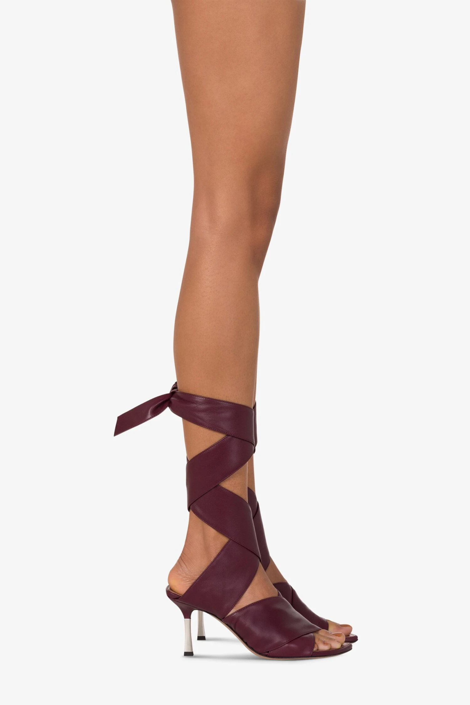 Wrap-around sandals with a contrasting silver galvanized heel in rouge noir leather. Made in Italy.